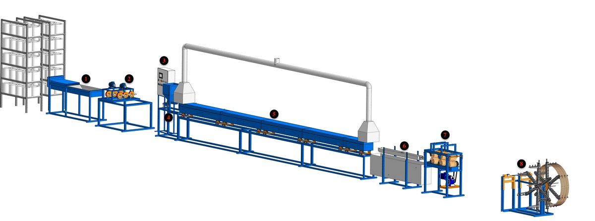 Данная линия позволяет серийно изготавливать стеклопластиковую арматуру для поперечного прутка диаметром от 2 до 6мм со скоростью до 110 000 метров за смену 12 часов.